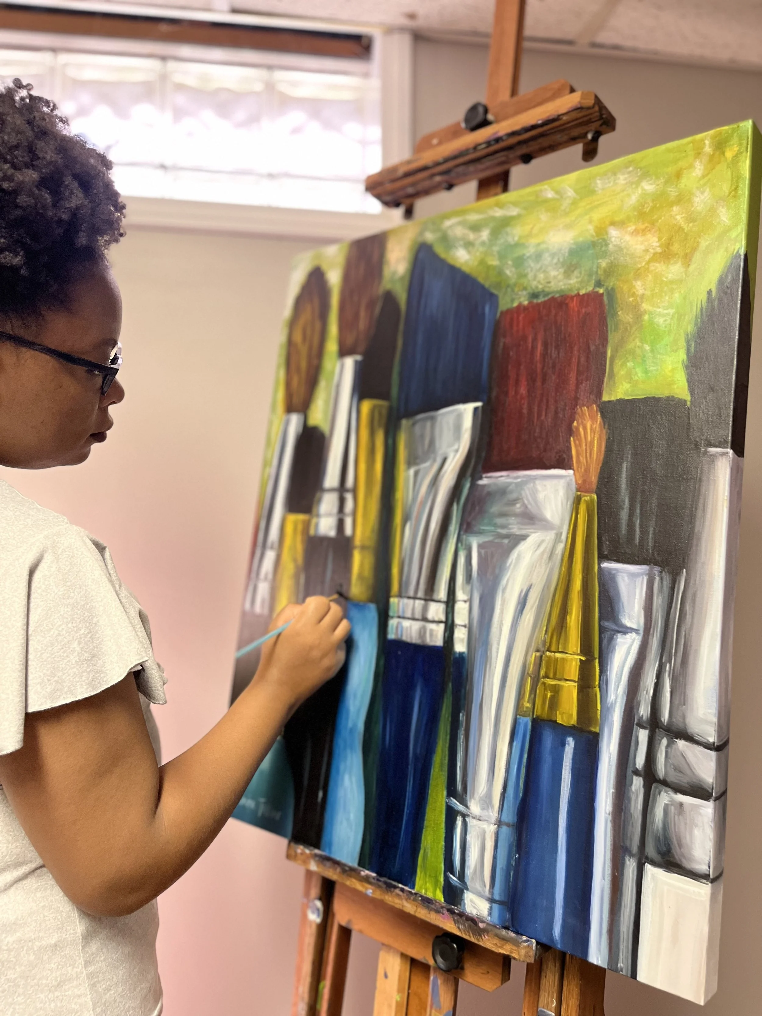 Jasmine Chantilly, who was born and raised in Cleveland, Ohio, knew she wanted to pursue the arts from a young age. Drawing captured her heart early on, but her passion for painting emerged while she was pursuing a masters degree in art therapy. The process of painting was invigorating. Jasmine found that it promoted mental clarity and living in the moment. When she was painting, she wasn’t thinking. Throughout her studies, painting provided respite from the endless personal reflection and the intense focus required to observe the behavioral patterns of others. Jasmine's love of painting and her background in art therapy both play a vital role in her unique artist voice and the focus of her work today.